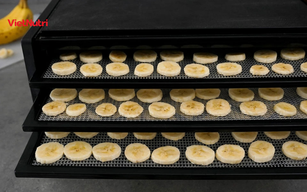 - Sấy dẻo bằng công nghệ sấy lạnh hoặc sấy nhiệt thấp: Đây là bước quan trọng giúp loại bỏ nước thừa mà không làm mất đi dưỡng chất và màu sắc tự nhiên của chuối.