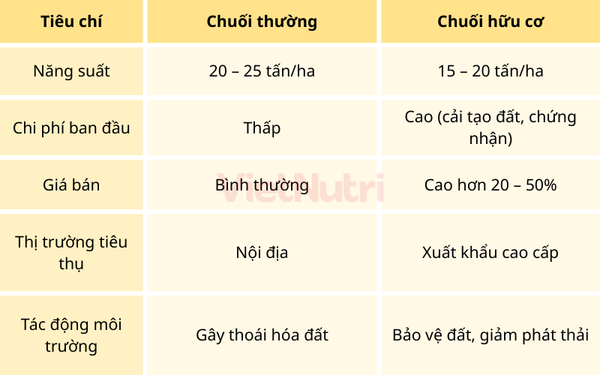 Về kinh tế, mặc dù năng suất có thể thấp hơn từ 10 – 20% so với chuối canh tác thông thường, nhưng theo thống kê của Tổ chức Nông lương Liên hợp quốc (FAO), giá bán chuối hữu cơ trên thị trường quốc tế thường cao hơn 20 – 50%, đặc biệt tại các thị trường khó tính như EU và Nhật Bản. Điều này giúp nông dân không chỉ bù đắp được phần năng suất thiếu hụt mà còn tăng lợi nhuận dài hạn nhờ giảm chi phí thuốc bảo vệ thực vật hóa học và nâng cao giá trị sản phẩm.
