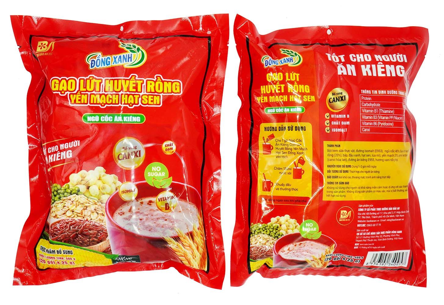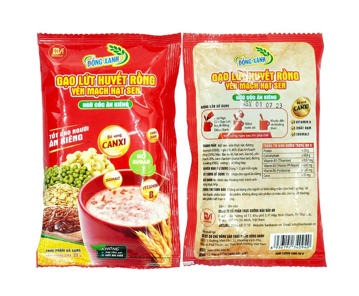 Ngũ cốc ăn kiêng Đồng Xanh cung cấp hàng loạt các loại dưỡng chất tốt cho sức khoẻ có thể kể đến như: protein, chất khoáng, chất béo, vitamin B1, B3, B6 và canxi, được phối trộn theo công thức độc quyền với các loại ngũ cốc như: bắp, đậu xanh, hạt sen, gạo lứt huyết rồng và yến mạch.